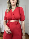 Cropped em tecido duna. Modelagem de amarração. É possível usar de diversas formas, ajustável ao corpo. Não possui bojo. Manga bufante com elástico no braço. Modelo usa TAM M, e tem sutiã tamanho 42, 98cm de busto.